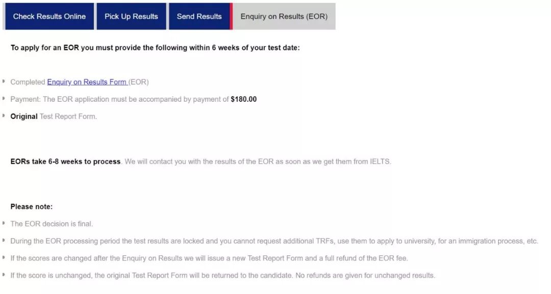 其实,雅思成绩复议的方法都大同小异,其他British Council旗下考试中心的宝宝们可以上到考试中心的官网,查询“Results”或者“Scores”页面,找到各考试中心相应的EOR申请办法。你最需要注意的是复议申请费用和付款方式相关信息,还有就是表格的第二页可能会有些许差异,不要盲目的用其他考试中心的表格。如果找不到关于EOR的信息,也可以电话咨询该考试中心。